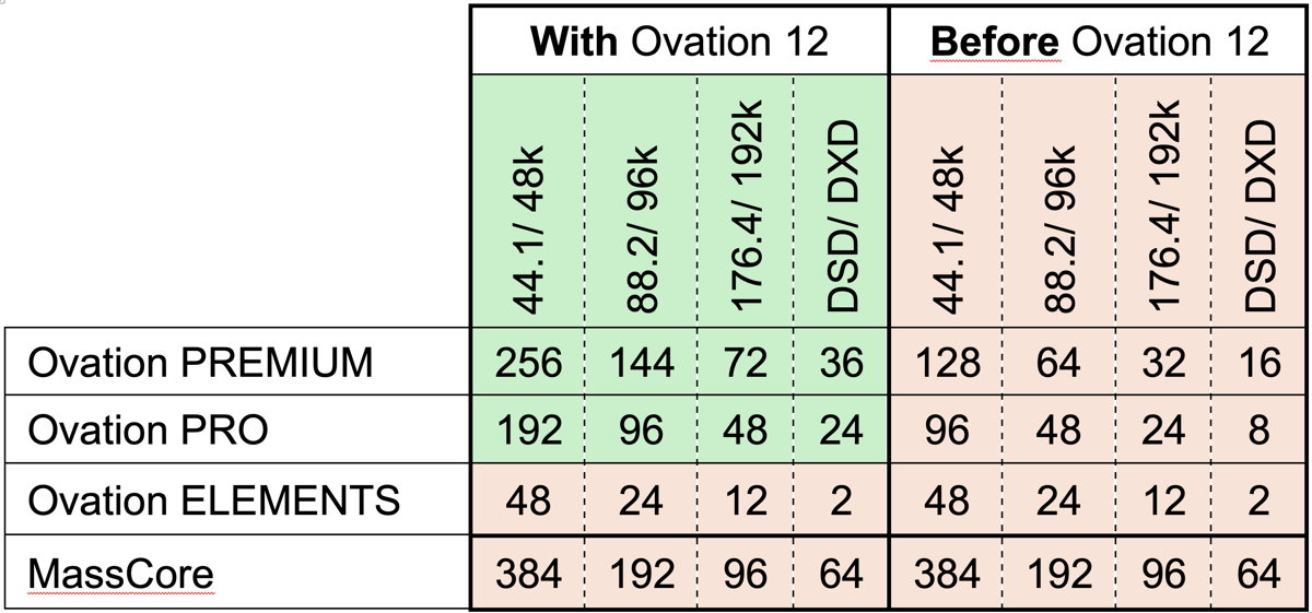 Ovation 12 significantly increases the number of simultaneous inputs and outputs available in Native mode across the ELEMENTS, PRO, and PREMIUM editions, while continuing to scale to extreme channel counts when paired with MassCore.
